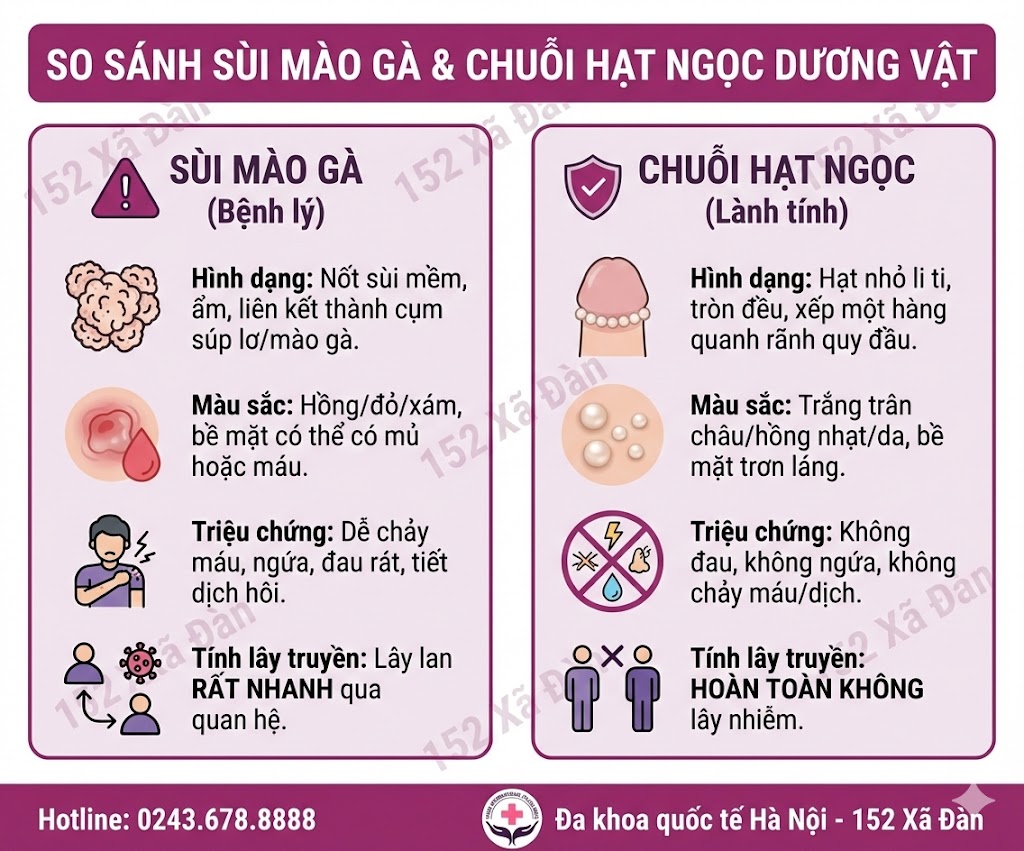 ➡️ Khác biệt cốt lõi: chuỗi hạt ngọc không phát triển thêm, sùi mào gà thì lan nhanh.