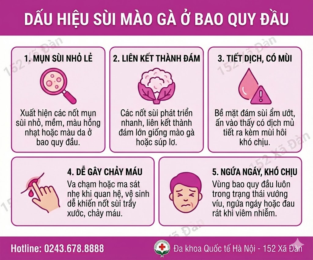 Trong khi đó, sùi mào gà giai đoạn sớm lại có biểu hiện rất kín đáo, nốt mụn nhỏ, mềm, màu hồng nhạt và gần như không gây cảm giác bất thường.